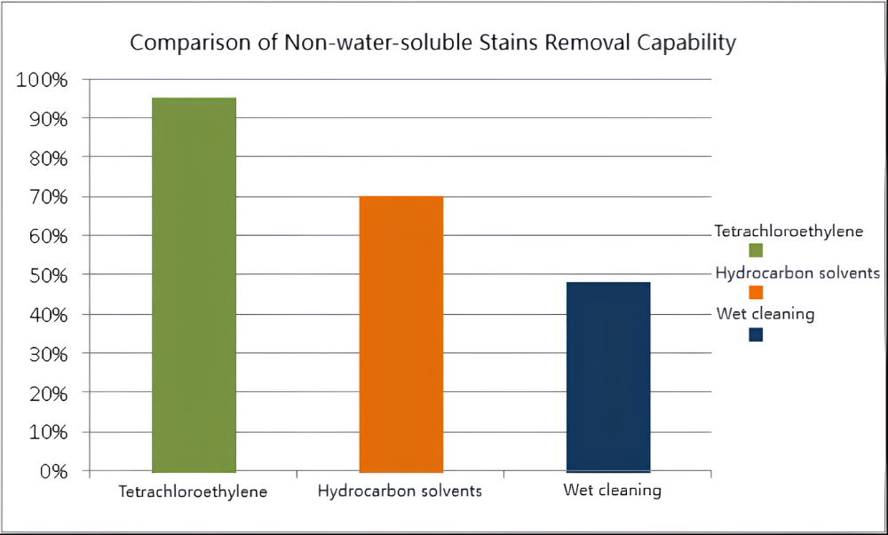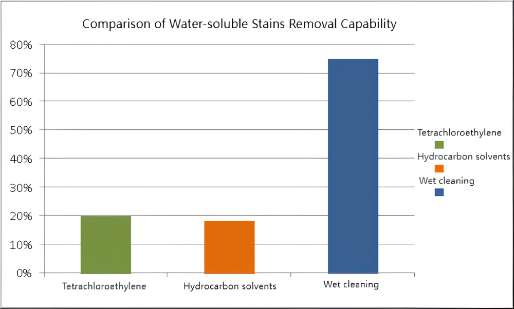 Curățarea umedă are cea mai puternică capacitate de a îndepărta petele solubile în apă, care pot ajunge la 75%, urmată de tetracloretilenă și solvenți cu hidrocarburi.