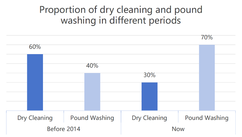 În urmă cu zece ani, raportul dintre curățarea chimică și spălarea cu kilograme era de aproximativ 6:4. Cu toate acestea, raportul dintre curățarea chimică și spălarea cu kilograme este de aproximativ 3:7 acum.